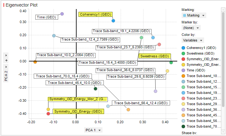 In the figure below the input variables are plotted in a 2D graph of PCA1 on the horizontal axis and PCA2 on the vertical axis. The variable with the highest PCA1 value is sweetness, a seismic attribute that highlights “sweet spots” that are frequently associated with sand shales as well as gas-saturated sands.