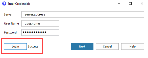 - After entering your credentials, click Login Wait a moment until Success displays beside the Login button. Then click Next.
