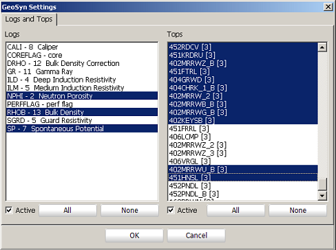 2. Select the desired log(s) and tops to import into GeoSyn, and then click OK.