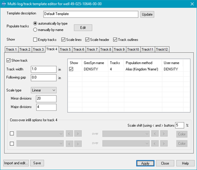 2. For the Populate tracks radio buttons, select either automatically by type (sonic, density, etc), or manually by name (Delta-T, Bulk Density, etc.) depending on the degree of control you want over which logs appear, and then click Edit.
