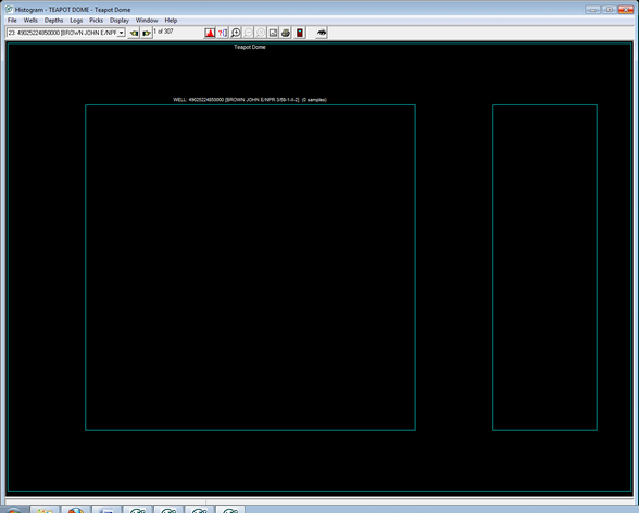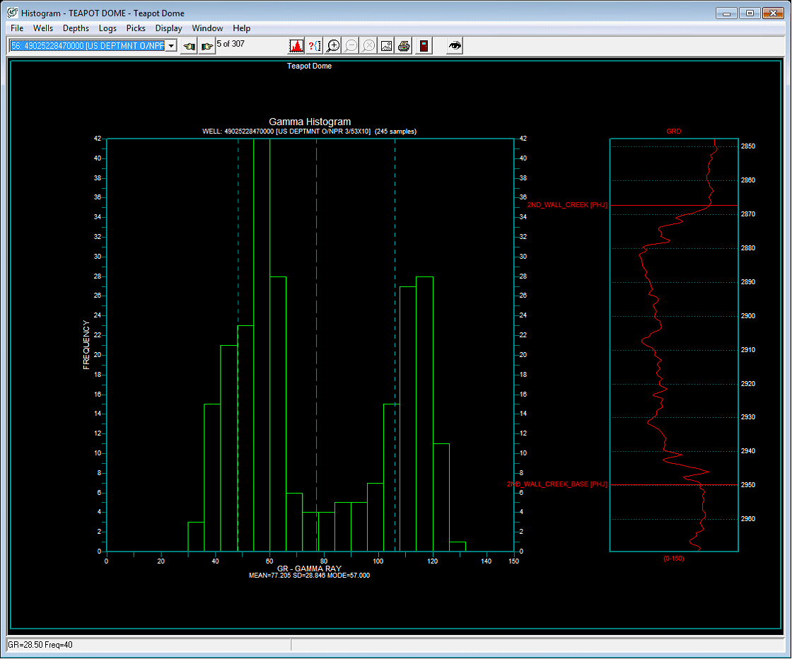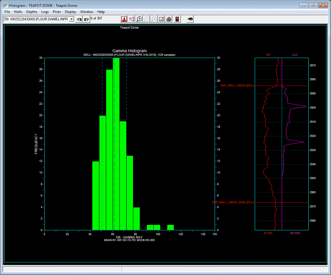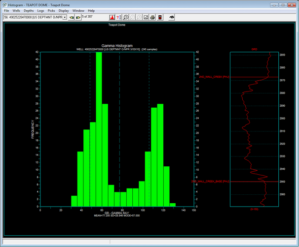 Loading/Saving settingsTo load or save histogram settings, select File>Load Settings or File>Save Settings on the menu bar at the top of the screen. Saving these settings creates a *.HS file that retains the selected curves, scales, and histogram settings. The Histogram Module looks at the log data stored inside the projects database, so the data is always live. Changing the curve data will change the appearance of the histogram, even after loading old settings. Selecting WellsIts often useful to only work with a small subset of wells in a project. The Histogram Module can select wells in a few different ways available from Wells>Select on the menu bar at the top of the screen. All Wells selects all wells available in the project. By Data Criteria selects wells based on a set of nested criteria including well header information, logs, or zone data. With Selected Curve selects only the wells that have the currently selected log curve on the Log Curve tab. Cross Section Wells selects the wells currently selected in the Cross Section Module. Well From Main selects the single well currently selected in the Main Module. All Wells From Main selects all wells currently selected in the Main Module. To switch between wells, select either the desired well on the dropdown at the top of the Histogram Module or use the left and right arrows to scroll through the selected wells. PageUp and PageDwn also cycle through the set of wells.