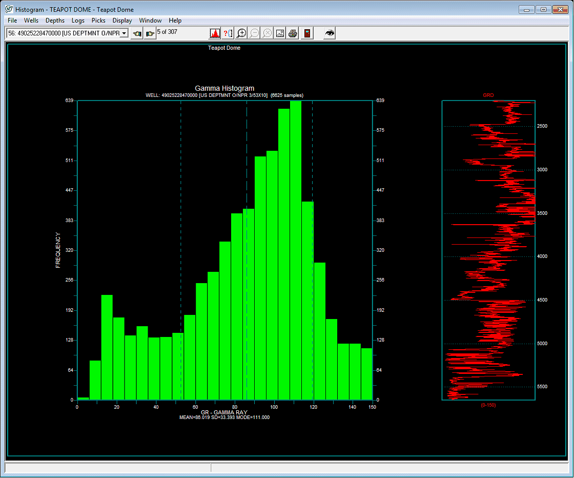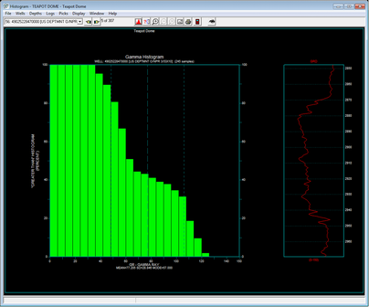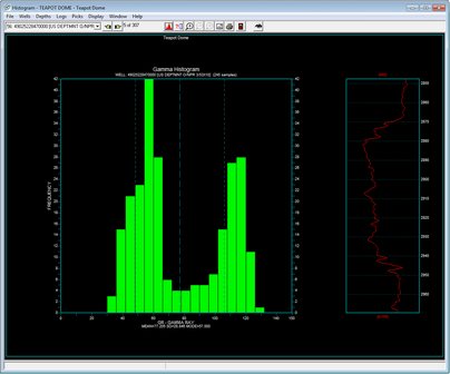 With a discriminator curve, the histogram shows a much tighter spread of gamma values since these resistivity cutoff excludes the shales above and below the sand. Note how the RILD discriminator curve is displayed to the right of the log curve. Discriminator curve values outside the minimum and maximum scale values will show up as a straight line on the edge of the log window.