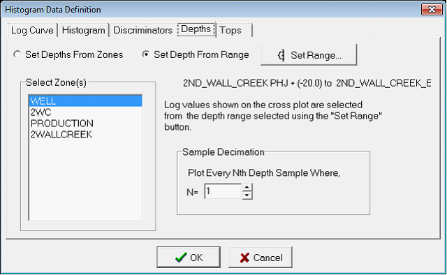 Setting DepthsIts often useful to limit the histograms data points to a specific interval of interest. Data points can be constrained by zone definition, tops, or by a specified depth (MD or TVD). On the menu bar at the top of the screen, select Depths>Set Depths