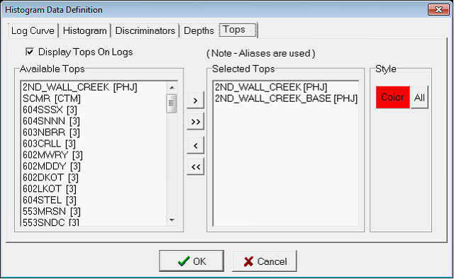 from the menu bar at the top of the screen or the To add a top, highlight the desired top name in the "Available Tops" list and click the add button (">"). This moves the log over to the Selected Tops list. To remove a top, highlight the top name in the Selected Tops list and click the remove button ("<"). The >> and << buttons add all tops and remove all tops, respectively. To change the color of a top, select the top on the Selected Tops list and select the desired color using the color box on the right. The example below adds the 2ND_WALL_CREEK and 2ND_WALL_CREEK_BASE tops to the display.