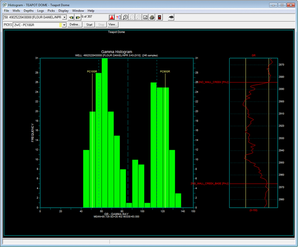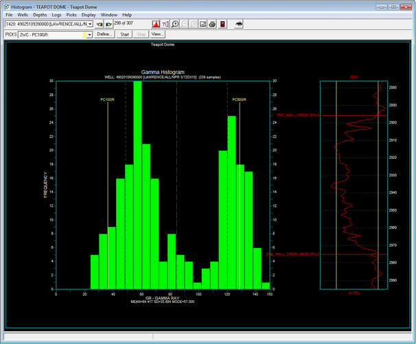 PicksPicks are database-stored curve values. Picks are most commonly used for log curve normalization, such as scaling all gamma ray values in a project to set sand and shale values. Commonly, picks are first created for the entire project from statistical measurements, and the histogram module is used to visually inspect and QC the pick relative to the actual curve. When working with picks, its usually a good idea make sure the CrossHair Cursor option is on. When this option is selected, (Display>CrossHair Cursor on the menu bar at the top of the screen), Petra draws a vertical line on the correlation log that corresponds to the cursors location on the histogram. This can make it significantly easier to see the relationship between the histogram value and the log. Displaying Existing PicksOn the menu bar at the top of the screen, select Picks>Define Picks from the menu bar at the top of the screen. Alternatively, select the The example below shows two picks: PC10GR and PC90GR. Both of these picks these are log statistics created in the Main Module (Compute> From Logs>Statistics ), where PC10GR is the curves 10th percentile, and PC90GR is the curves 90th percentile.