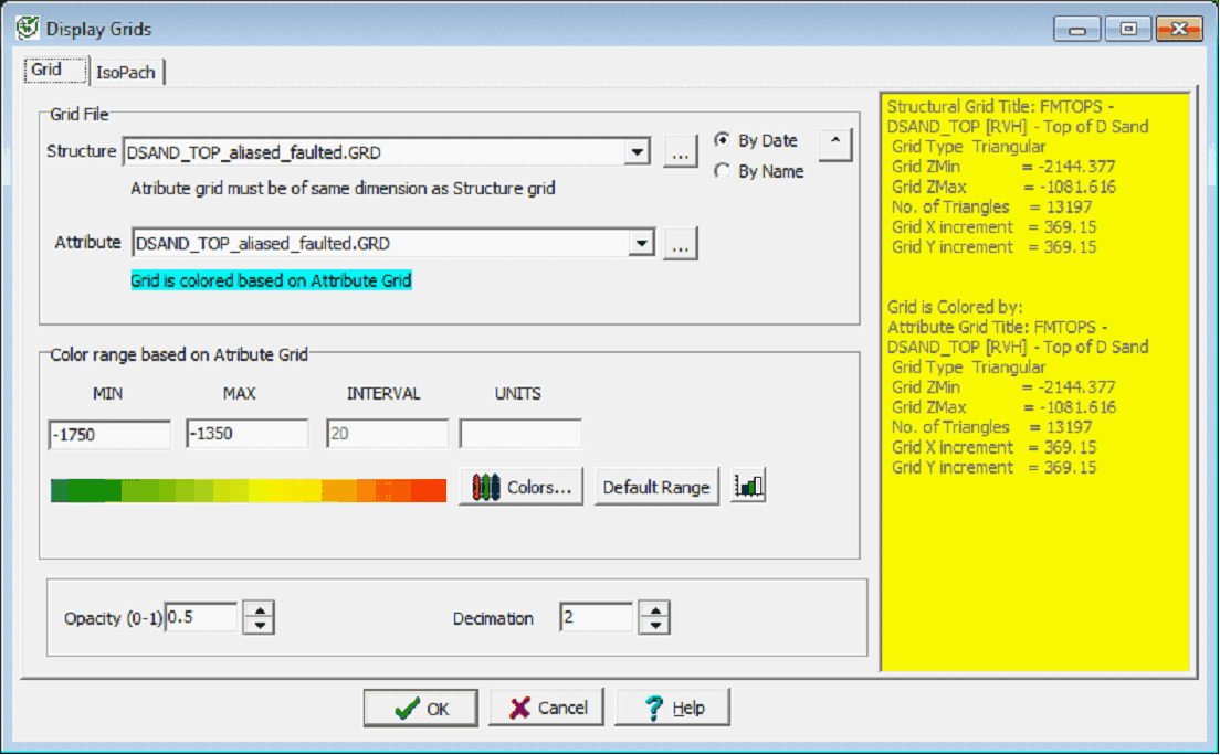 Grid tabThe Grids dialog allows the selection of a Petra structure grid (depth) and an attribute grid (color). The attribute grid defaults to the structure grid, although a different attribute grid may be selected. The attribute grid must have identical grid characteristics as the structure (same size and bins). The colors for the attribute grid may be changed and the opacity may be adjusted.