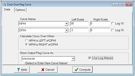 The Data tab is used to select log curves and their scales. Petra scales the curves to these values and calculates where one curve crosses another. In other words, cross over is calculated as if the curves were actually plotted. In the example below, cross over is established when neutron porosity (NPHI) is to the right of density porosity (DPHI) even though NPHI is on a 0-30 scale and DPHI is on a 0-0.3 scale.