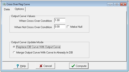 Output Curve Update Mode When the cross over curve named above already exists, you have the option of updating the curve or replacing the curve. Updating the curve will merge the new pay curve into the existing one, leaving the pay curve outside of the depth limits untouched. Replacing the curve, on the other hand, will null the rest of the pay curve outside of the depth limits.