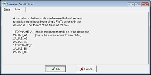 Apply Fm Substitution To The Following Data TypesProdFm and FMatTD - This option applies the formation substitution to the well's "Prod. Fm" and "Fm at TD" entries displayed on the Main Module's Well tab. Fm Tops - This option applies the formation substitution to the project's formation tops available on the Main Module's FmTops tab. Projected FM - This option applies the formation substitution to the project's PROJFM data item in the WELLS zone. DSTs - This option applies the formation substitution to the project's DSTs, available on the Main Module's Fm Tests tab. IP Tests - This option applies the formation substitution to the project's DSTs, available on the Main Module's IP Tests tab. Interval FMNAME - This option applies the formation substitution to the FMNAME column for all the project's interval tables. This will include the default LITH, CORE, PALEO tables, as well as any user-created interval tables. Cores - This option applies the formation substitution to the "Formation" entries in the project's Cores, available on the Main Module's Cores tab. Prod Cum Data - This option applies the formation substitution to the "FMNAME" column in the project's Prod Cums, available on the Main Module's Prod Cums tab. Zone Cum Data - This option applies the formation substitution to the Zone Cumulate Production data items created by the Compute Cumulative Production tool. Info tabThe info tab simply illustrates the proper formatting for formation substitution files. These files can be created manually, or by using an existing project's formation top aliases with the Save FmName Alias File tool.