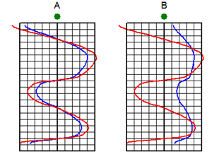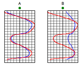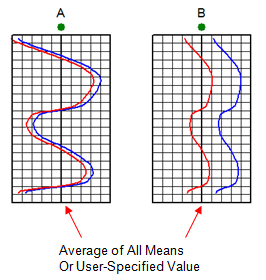 In the example below, well A's original curve (blue) is very close to the overall baseline (in the middle of the track) while well B's original curve reads high and to the right relative to the baseline set in the middle of the track. Well A's normalized curve (red) doesn't shift too much, while well B's normalized curve shifts to the left.
