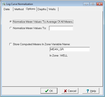 Normalization Depth Zone - This option sets the upper and lower limit of the normalization based on a zone's interval definition. Ideally, this zone should restrict the normalization to a lithologic package in which the log curves have a common reading from well to well. Large depth intervals can skew results.