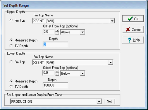 In the Set Depth Range box, select the relevant top, MD, or TVD button. For MD and TVD, select the relevant button and enter the adjacent depth in the entry field. For tops, select the desired top from the Fm Top Name dropdown box. Notice that an offset can also be added or subtracted to the fm top; this offset will include data points above or below the actual fm top depth.