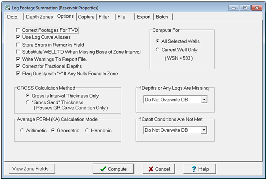 These summed footages and reservoir parameters can be computed for one or more zones simultaneously. The calculation can be done for all selected wells in the main module or on only the currently selected well in the main module.