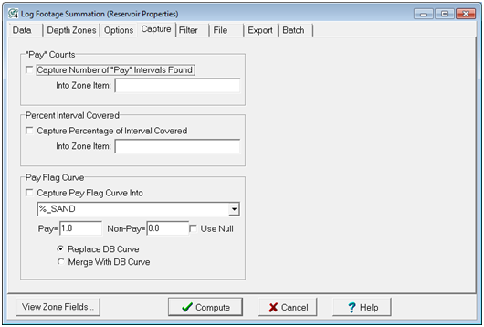 "Pay" Counts - This section allows you to capture the number of "pay" intervals that passed the cutoff criteria within each computed zone. The number of "pay" intervals will be stored in the specified Zone Item name. There will be a count for each zone interval selected for calculation. Higher pay counts can reflect multiple pay intervals within a zone, or more variable reservoir quality.