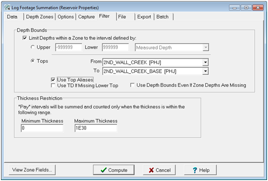 To open the Log Footage Summation tool, select Compute>From Logs> Footage (Reservoir Properties)