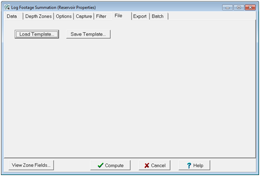The File tab allows you to save log footage settings and recall them later. This is useful if you are working with multiple pay zones or with running multiple petrophysical cutoffs. Saving templates is also useful for running batch footage summations with the Batch tab.
