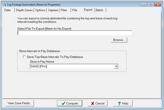 The Export tab allows you to export a comma delimited spreadsheet file (*.CSV) that contains the top and base of each log interval meeting the log criteria. This can be very useful for developing an inventory of uphole pay zones behind pipe.