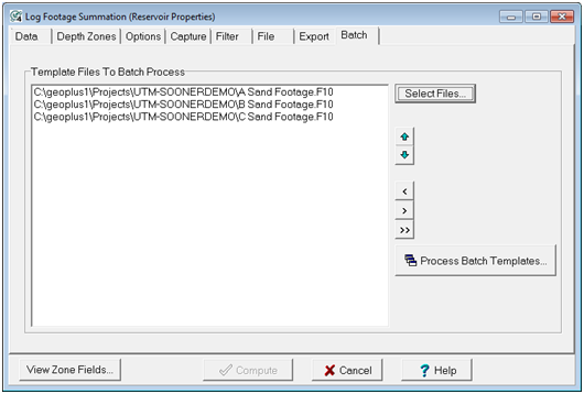 The Batch tab allows you to run multiple log footage summation templates (see FILE TAB above) as a batch. This is particularly useful for areas with multiple pay zones, or for running summations on the same zone in different ways with different curve conditions. You change the queue either by using "Select Files" or by using the add "<", drop ">", or clear all items ">>" buttons
