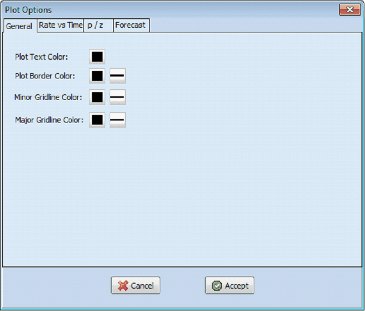 Plot Text Color - This option sets the text color on the Decline Curve Analysis Module. Plot Border Color & Thickness - The left button sets the border color around the plot, while the right button sets the line thickness Minor Gridline Color & Thickness - The left button sets the minor gridline's color on the plot, while the right button sets the line thickness Major Gridline Color & Thickness - The left button sets the major gridline's color on the plot, while the right button sets the line thickness Rate vs Time tab