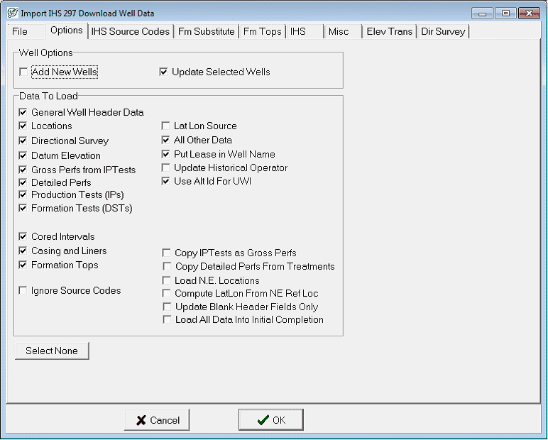 Particularly in Texas, IHS locations sometimes have a source code that reflects the origin of the latitude and longitude. This option loads location source data into the Misc Location Information field on the Main Modules Location tab.