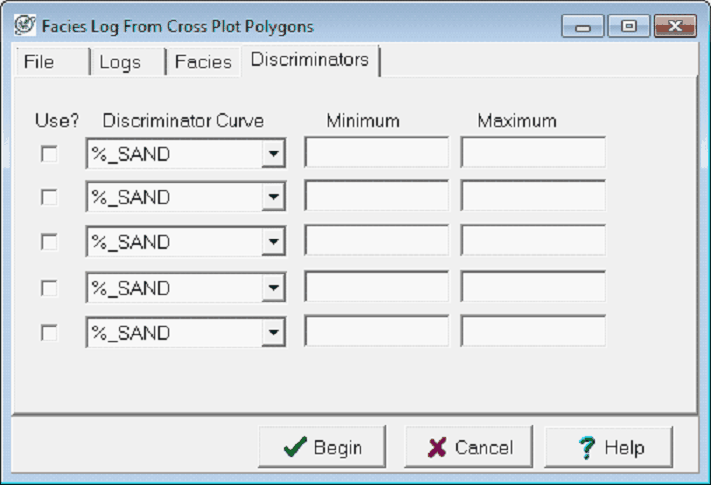 The Discriminators tab filters data points by log criteria.  To set a discriminator curve, select up to 5 curves and set the scale using the minimum and maximum entry boxes.  Data points that fall outside of these data criteria are not included in the facies curve and will be given the default facies value entered on the Facies tab.