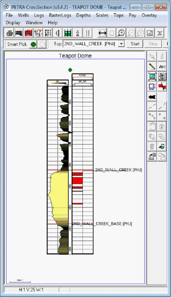 Log Values For Each Facies Polygon – This window lists each of the polygon names along with their respective facies values.  By default, Petra uses each polygon’s “facies value” created in the Log Crossplot Module.  To change a polygon, select the polygon name on the list, and change the value on the “Edit Value” box.  Select the “Change Value” button to accept the changes.  In the example below, depths where the gamma ray and deep resistivity fall into the “PAY” polygon will be coded as 1 on the facies curve, while all other depths will be set to zero.