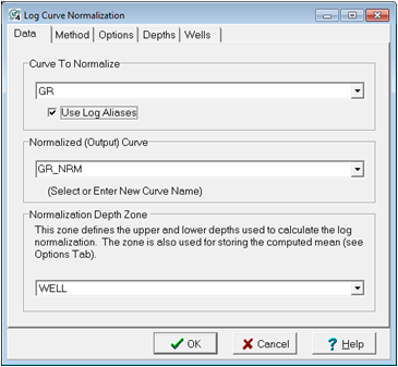 The data tab section contains the input and output log curve selections and the normalization depth Zone.