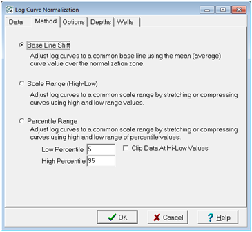 Percentile Range - This method adjusts each curve such that two given percentiles have a common minimum and maximum value. By using a percentile rather than the absolute maximum or minimum, this method is less prone to anomalous effects caused by washouts or other data spikes. This option effectively stretches and squeezes the curves to use a new range, which can change both the magnitude and shape of the curve. This method is best used to normalize old, less sensitive logs with newer, more sensitive logs. This method can adjust the curves to the computed average minimum and maximum values of all curves or to a user-defined range.