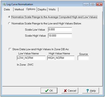 Store Data Low and High values In Zone DB As - This option stores the computed high and low values for the original curve in two data items in the zone selected on the Data tab. This can be useful for for mapping or troubleshooting later. By default, Petra will store the high and low values in data items called "LOW_NORM" and "HIGH_NORM." To change this data item, enter new data item names.