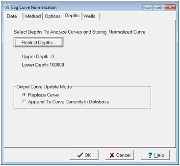 This tab controls how Petra limits the normalization process to a specific depth interval, and how Petra overwrites existing log curves.