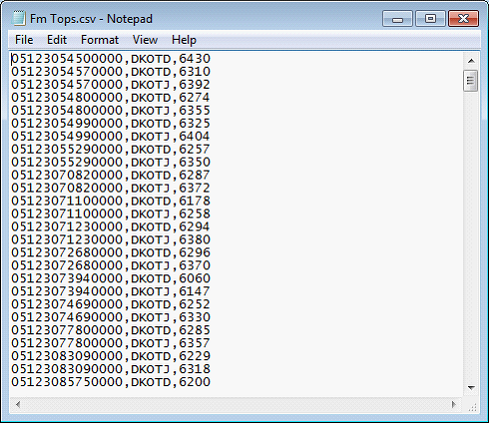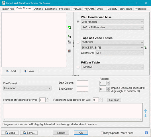 To add a field definition for a comma- or tilde-delimited file, select the desired field in the Data Record window. Note that Petra counts the number of commas to establish a Field Number. Next, select the relevant data type on the set of dropdown menus on the right. Select the + add button to add the definition to the "Field Definitions" list box. To add a field definition for a columnar file, swipe relevant data field on the Data Record window Petra fills in the Start Column and End Column. Next, select the relevant data type on the set of dropdown menus on the right. Select the + add button to add the definition to the "Field Definitions" list box. In both cases, to modify a field definition, use the "Implied Decimal Places" This option scales imported values by multiples of 10. As an example, a 1 here will divide the incoming data by 10 and a 2 will divide the incoming data by 100. This is useful for changing values expressed as percentages (1-100%) into values expressed as decimals (0-1). Saving / Loading field definition templatesSince creating a long list of field definitions can be tedious, it is a good idea to save your work. Petra can save these column and field definitions as a template Format File with a *.FMI extension. By default, Petra stores template files to the private parms directory. To save a field definition template file, select the Save button. To load a pre-existing format template, select the Load button. |