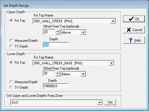 Setting DepthsIts often useful to limit the histograms data points to a specific interval of interest. Data points can be constrained by zone definition, tops, or by a specified depth (MD or TVD). On the menu bar at the top of the screen, select Depths>Set Depths
