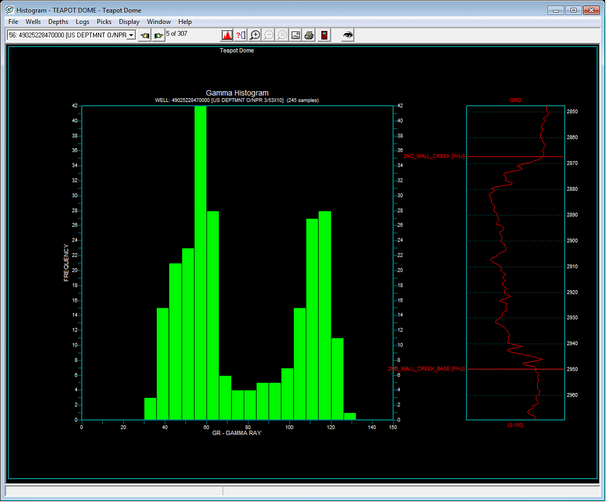 Loading/Saving settingsTo load or save histogram settings, select File>Load Settings or File>Save Settings on the menu bar at the top of the screen. Saving these settings creates a *.HS file that retains the selected curves, scales, and histogram settings. The Histogram Module looks at the log data stored inside the projects database, so the data is always live. Changing the curve data will change the appearance of the histogram, even after loading old settings. Selecting WellsIts often useful to only work with a small subset of wells in a project. The Histogram Module can select wells in a few different ways available from Wells>Select on the menu bar at the top of the screen. All Wells selects all wells available in the project. By Data Criteria selects wells based on a set of nested criteria including well header information, logs, or zone data. With Selected Curve selects only the wells that have the currently selected log curve on the Log Curve tab. Cross Section Wells selects the wells currently selected in the Cross Section Module. Well From Main selects the single well currently selected in the Main Module. All Wells From Main selects all wells currently selected in the Main Module. To switch between wells, select either the desired well on the dropdown at the top of the Histogram Module or use the left and right arrows to scroll through the selected wells. PageUp and PageDwn also cycle through the set of wells.