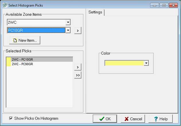 button from the Picks toolbar at the top of the screen. This opens the Define Histogram Picks window. Here, select an existing zone data item with the zone (top) and data item (bottom) in the Available Zone Items box.