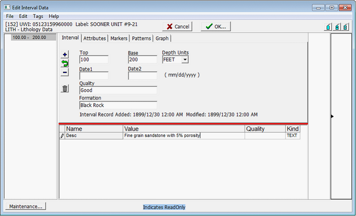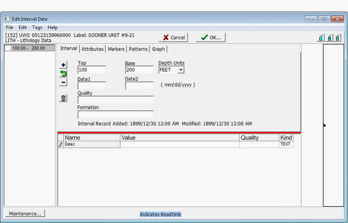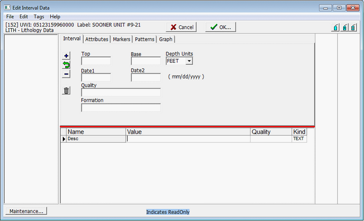 New interval data can be brought into Petra either manually or by a tabular data import. Adding New Data Manually To add new intervals manually, first select the correct well in the Main Module. On the Interval tab, select the right interval table. In the example below, the LITH table is selected. Finally, select the Edit details button in the upper right on the Interval tab. This brings up the Edit Interval Data window for the selected interval table. Continuing with the example, the Edit Interval Data window below shows the fields for only the LITH table.