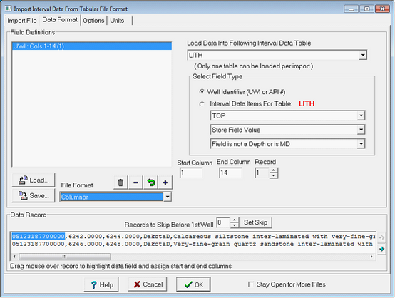 Once the file containing the interval data is opened, Petra switches to the Data Format tab. This tab essentially links the entries in the file to specific kinds of data. The first step is to select the interval data files formatting under File Format. Files can be imported into Petra in one of three formats: Columnar, Comma Delimited, or ~ Delimited. Columnar data organizes data into fixed columns, where Petra imports data based purely on the number of characters from the left. The left screenshot, on the other hand, shows the API number as defined by columns 1 through 14. Comma and ~ delimited data, on the other hand have no fixed column size and are instead separated by a comma or a tilde. With delimited data, Petra imports data based on the Field defined by the delimiter. The example below shows the same UWI/API field defined in two different ways. The right screenshot shows the API number defined as Field (1), i.e. it is separated by the first comma.