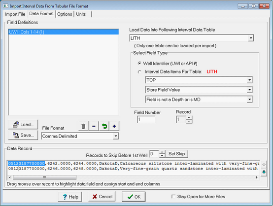 To save the field definitions and options, select the Save button. This option saves a *.FMI file. Selecting the "Load" button restores all the saved settings. Most data files have some header or comments at the top. The Records to Skip Before 1st Well option tells Petra to skip a set number of lines before importing any well data. Click the "Set Skip" button to set the number of skipped records based on the record currently in the data record window, |