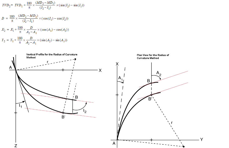 This algorithm is the industry standard. The drilled section is treated as a curve inscribed on a cylindrical surface with a vertical axis. The vertical and horizontal projections of this curve are assumed to be the arcs of circles whose radii are calculated as functions of the build up rate and the rate of change of the azimuth. Radius of Curvature is expressed using the following formula (from “Formulas and Calculations for Drilling, Production, and Workover,” Lapeyrouse, Norton J., Gulf Publishing Co.):