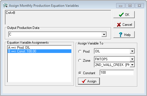 This is where you tell Petra what production streams, constants, or zone data items you want included in the equation. Click on a variable in the Equation Variable Assignments box. Next, click on a Prod, Zone, or Constant button in the Assign Variable To section. Click on the associated drop down box and find the specific strean or data item or enter a constant. Finally, click on assign. This will change the Equation Variable Assignments box to reflect the correct variable. Using the exact names in the equation tab will cause Petra to guess at the variable assignments, which can save time