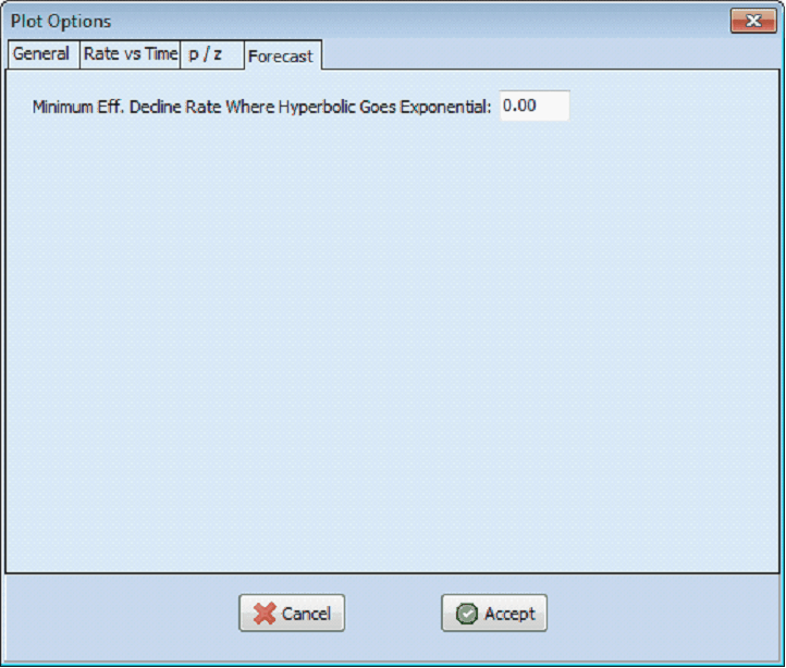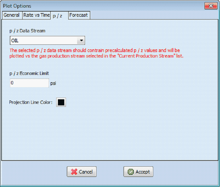 p/z Data Stream - This dropdown selects the data stream containing the p/z stream. p/Z Economic Limit - This option sets the economic limit in psi. Projection Line Color - This limit sets the projection line's color. Forecast tab