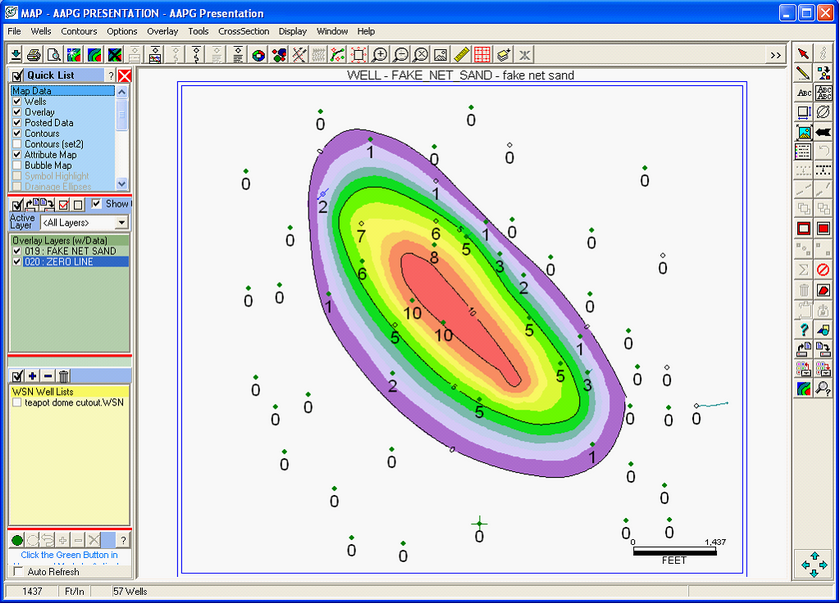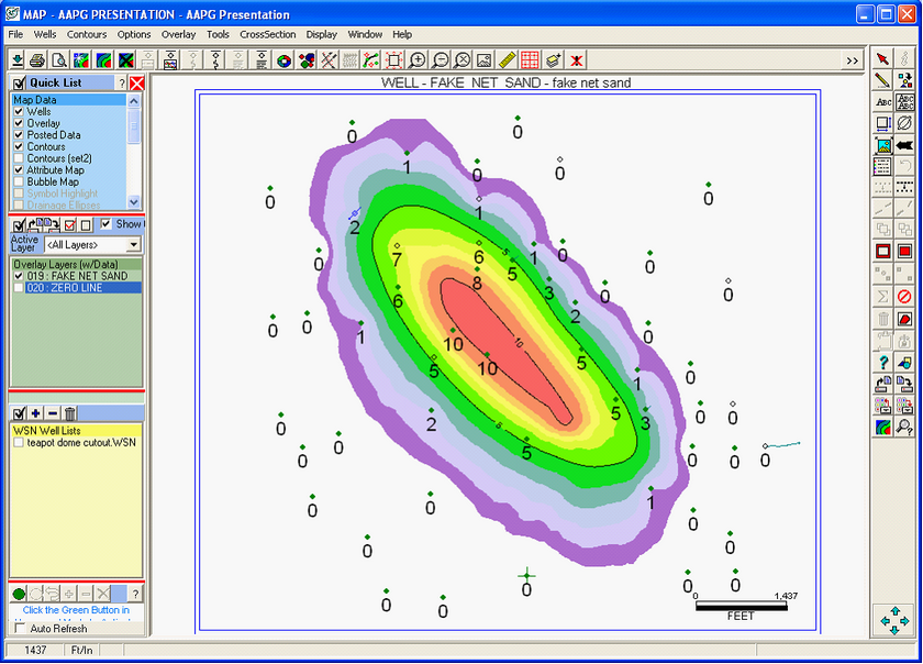 Use Overlay Contour Lines and Include Faults options on the Create Contour Grid tool's Data tab. Contour LinesHand-drawn contour lines are a great way to add geologic interpretation to a computer-generated grid. Since each line is assigned a value, Petras gridding tries to honor those values when creating a grid. Since Petra uses all the displayed contours when it grids, its a good idea to store each related set of contours in its own overlay layer.