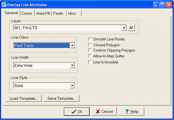 FaultsIn the Map Module, faults are treated as a special class of overlay line. Just like any other overlay line, faults lines have width, color, and an assigned layer. Unlike other overlay lines, however, faults have a special tab labeled Faults. This tab controls how fault symbols are drawn, as well as how Petra handles the fault during the creating a computer-generated grid. Since faults are irregular surfaces, Petra uses triangulation when creating a faulted grid.