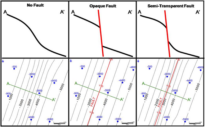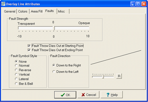 Setting an overlay line as a fault (Left), setting the fault strength and fault symbol (Right) High-angle, near-vertical faults are drawn as a line, while low-angle faults with aerially missing section can be drawn as two separate faults that form a polygon. Since computer-gridding can create contours inside these fault polygons (where the surface should be missing), its a good idea to blank these polygons out with an opaque polygon. Fault StrengthOn a hand-drawn contour map, a fault breaks contour lines. Put another way, a fault breaks a map into two different parts. Data on one side of the fault is only relevant to that fault block, and has less (if any) relevance to the map on the other side of the fault. Similarly, a drawn fault tells Petra to interpolate the gridded data up to the fault and ignore data across the fault. The opacity of the fault determines the strength of this break. A low opacity fault will still be largely connected, while a completely opaque fault will ignore data across the fault entirely. Practically, this means that the opacity of the fault influences both the faults throw and the amount of fault drag. High opacity faults have greater throw and more independent fault blocks, while transparent faults have lower throw and greater amount of fault drag. Completely opaque faults cause grid nodes to be nulled along the fault, which can create a saw-tooth effect of color-filled grid along the fault.