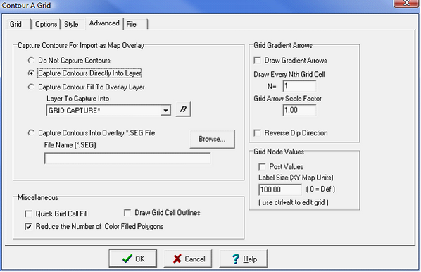 This method captures contour lines from a grid to an overlay layer. Once these lines are overlay contour lines, they are editable just like any other line. This technique can be useful for letting Petra build a quick first pass at contour lines, and then using an interpreters skill to modify them into a more reasonable geological interpretation. Depending on the complexity of your contours, this can be very labor- and time-intensive. For most contour maps, its almost certainly faster and better to hand-draw overlay contour lines from scratch. Under the Advanced tab, select Capture Contours Directly Into Layer, and then select the Overlay layer you want to contain these contours. The R button allows you to rename the layer. In the example below, the overlay layer has been renamed to GRID CAPTURE.
