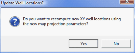 Select Save to enact the changes. For new projects this will simply set the project's map projection. For existing projects, saving a different coordinate system means that the XYs of all the data will need to change as well. Make sure to select Yes when Petra asks to recompute XY well locations using the new map projection. See Final Steps later in this help file to reproject grid files.