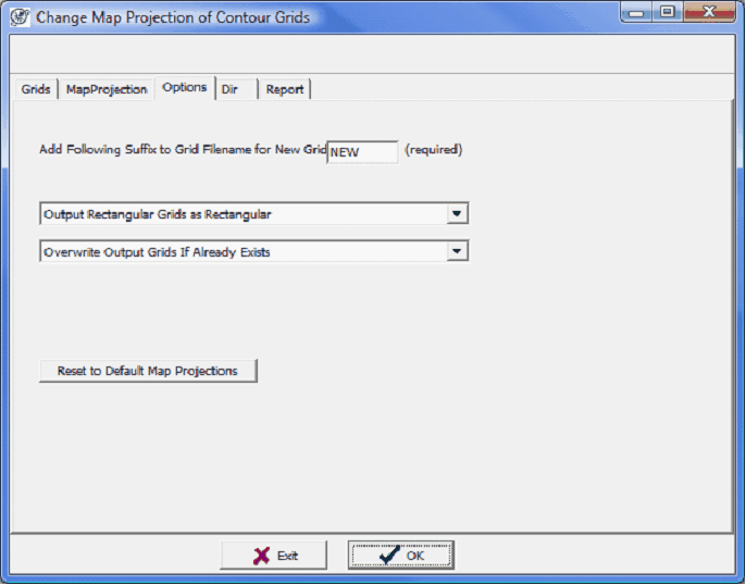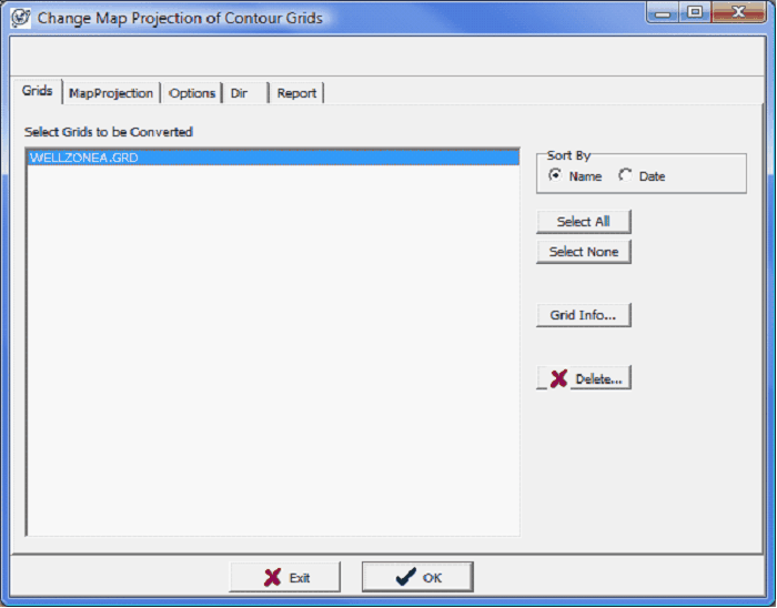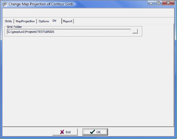 The Dir tab changes the directory of reprojected grids. This tool will only reproject grids within this folder. If your grids are stored in multiple folders, its probably best to perform this operation several times to get all different folders. To reproject the grids, select OK. Petra will review the selected grids and generate a report.