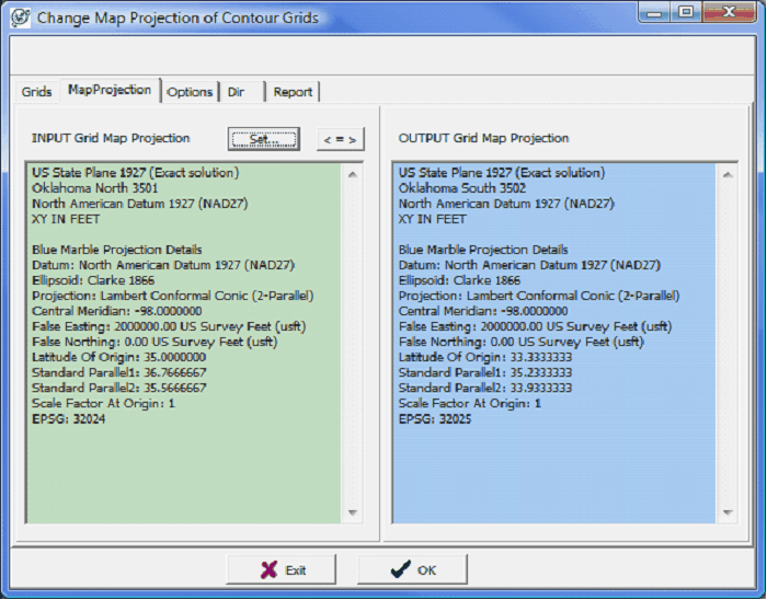 The Grids tab shows the grids contained inside the projects GRIDS folder. To change this directory, select the Dir tab. Next, select the grids to reproject. The MapProjection tab shows the map projection of the grids on the left in green and the new grid map projection on the right in blue. Notice that in this example, the grid was Oklahoma North (NAD27) and will be reprojected to Oklahoma South (NAD27).