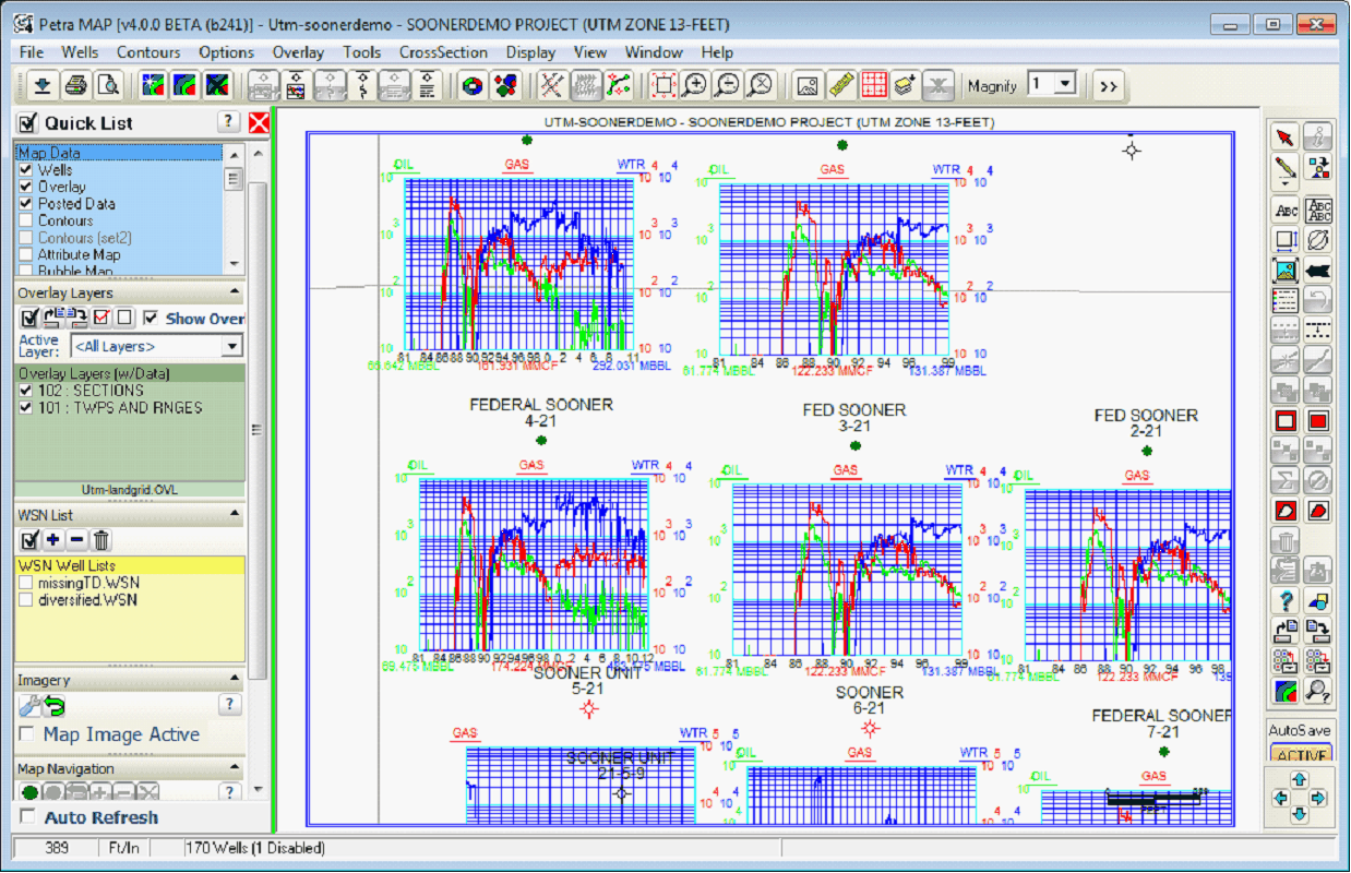 The monthly production chart displays up to 3 monthly production variables as a small graph next to the selected wells. To set up monthly production charts select the