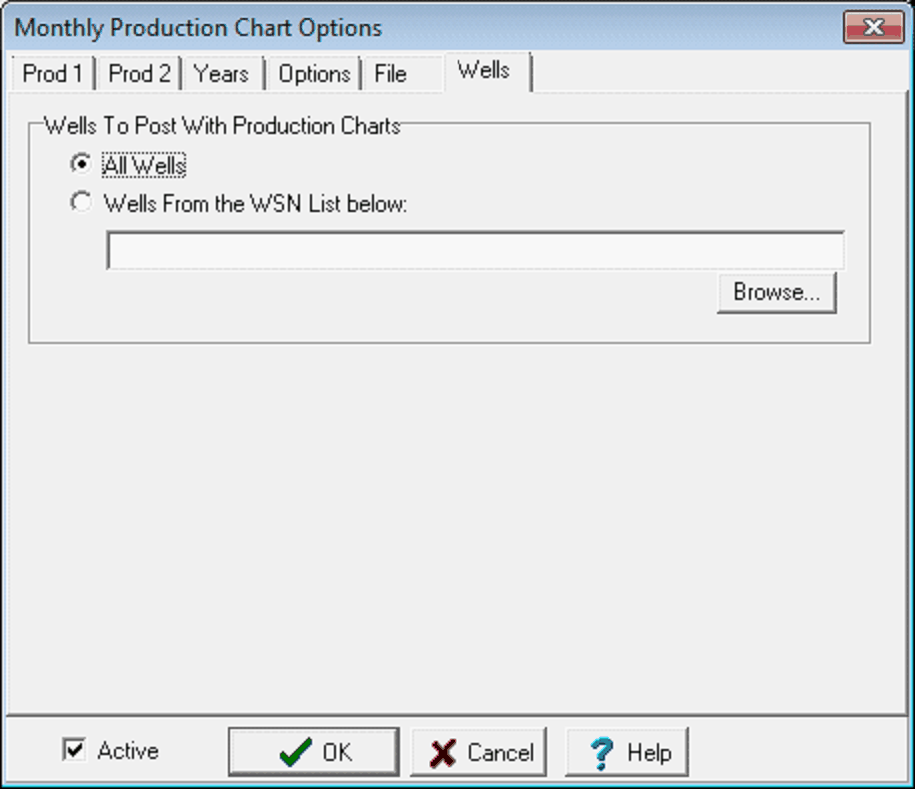 The Wells tab selects a smaller subset of wells to display a production chart. The wells tab section provides options for posting production plots only on a subset of the wells on the Map Module. All Wells On Map - This option plots production plots on all wells on the Map Module. Wells From the WSN List below - This option uses a well list to select the wells with production charts. Only wells on the WSN list will display production plots. |