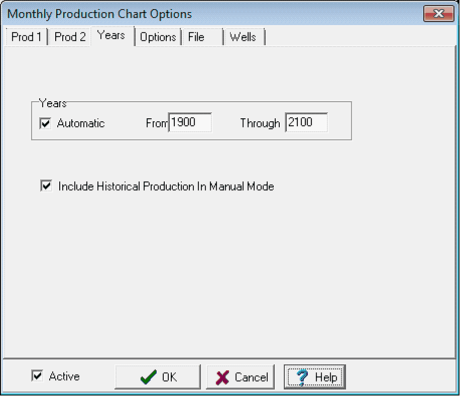 The Years tab sets the extents of the X axis Automatic - This option sets automatic scaling for the X axis of the production chart to the first and last month of production. From & Through - These entries set limits on the duration of production data. By default, Petra displays data from 1900 through 2100, which will be much too big a range for most applications. Include Historical Production in Manual Mode - Some states record historical production in a single historical year labeled "0." This option includes this historical year 0 in when years are set manually. |